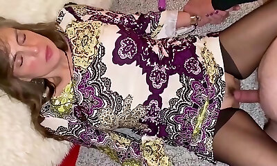 Brunette crud in black stockings gets fucked in missionary position